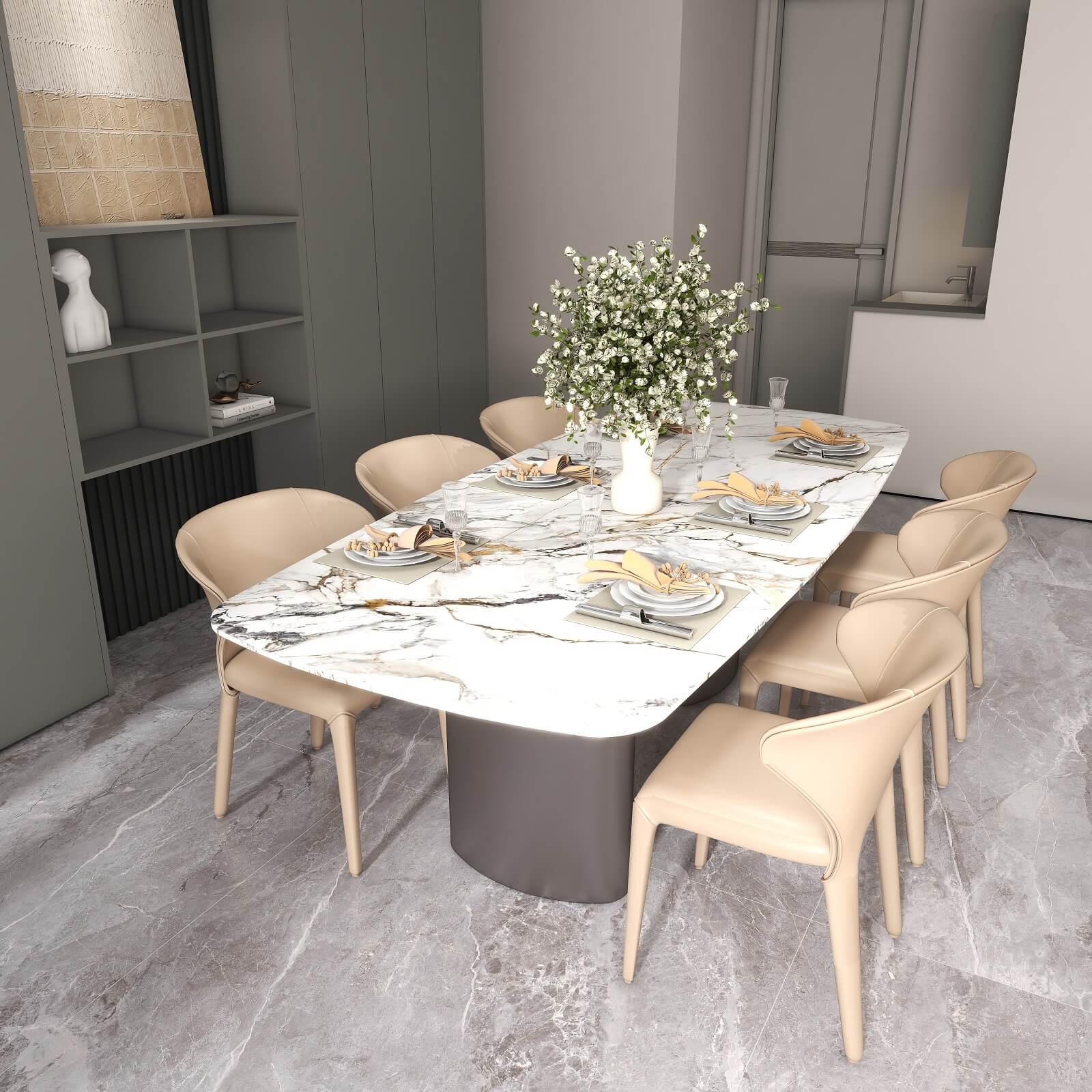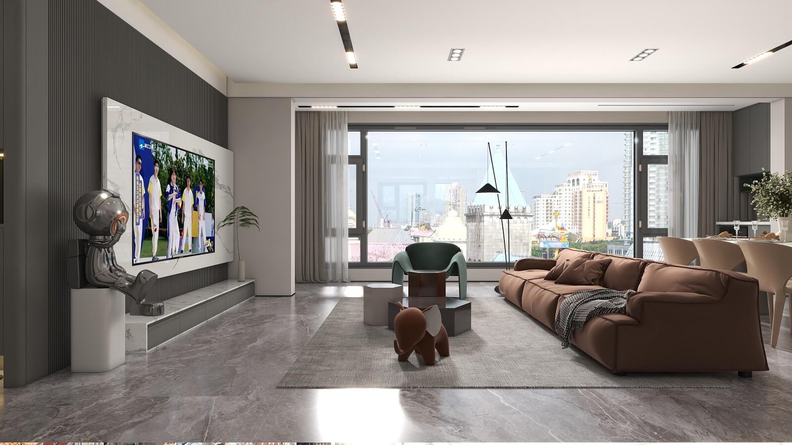 光影流动,木饰面、大理石、木格栅交织出不同层次秩序,给予空间精致质感。